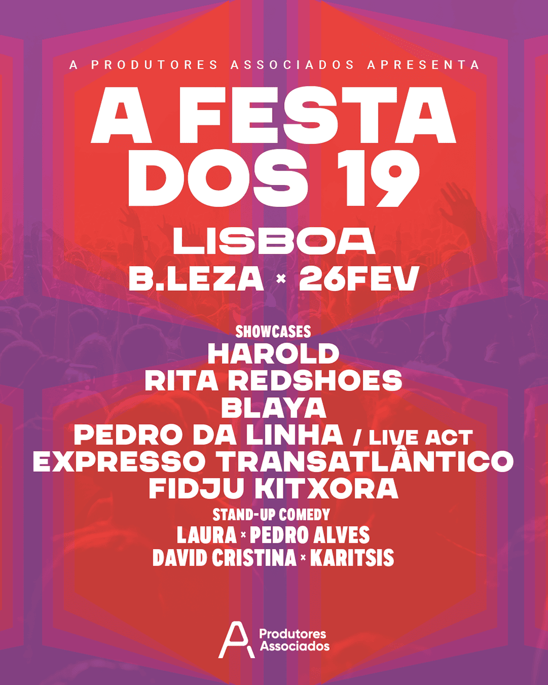 A Produtores Associados celebra 19 anos a 26 de fevereiro no B.Leza, com showcases musicais e stand-up comedy.